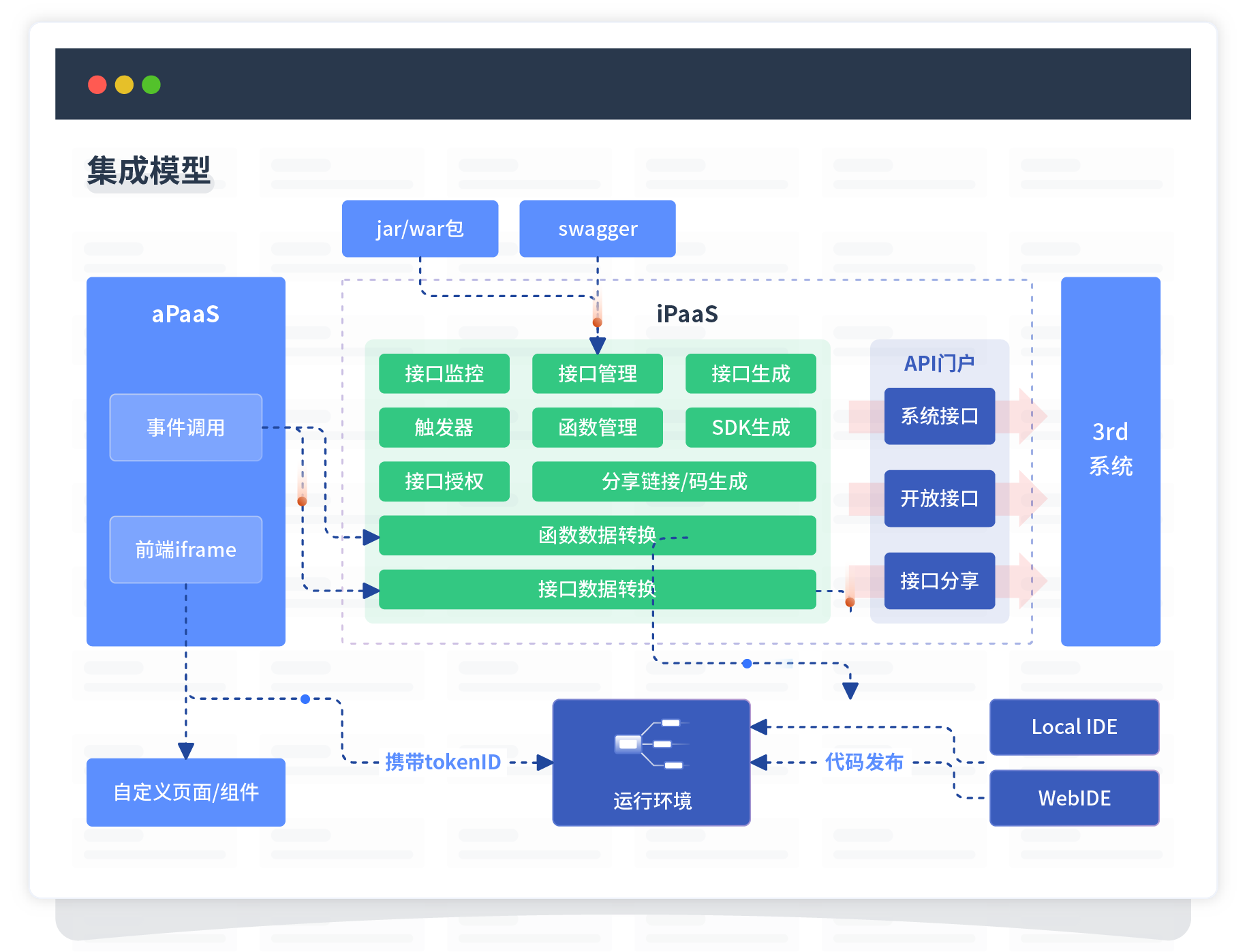 集成模型包括平台本身前、、、、、、、、后端能力的扩展,,,,,,,,,也支持通过API门户和第三方系统进行交互。。。。。。。。