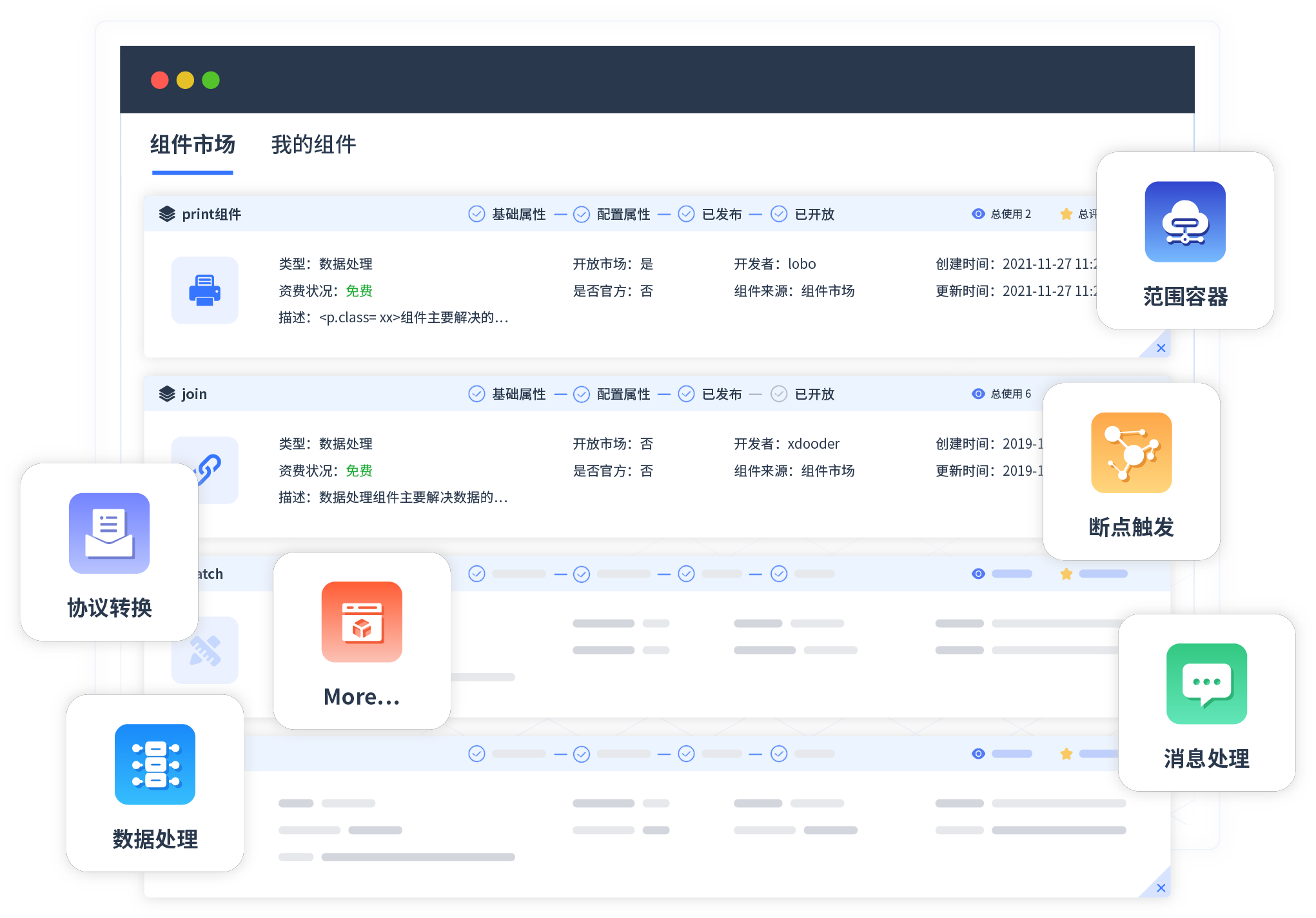 针对集成场景,,,,,,,,,,,EBPAY提供组件市场,,,,,,,,例如协议转换、、、、、、、、、消息处理、、、、、、、、、、、、、、、文件操作等。。。。。。。除平台提供的组件外,,,,,,客户可以自定义所需组件。。。。。。。。。。