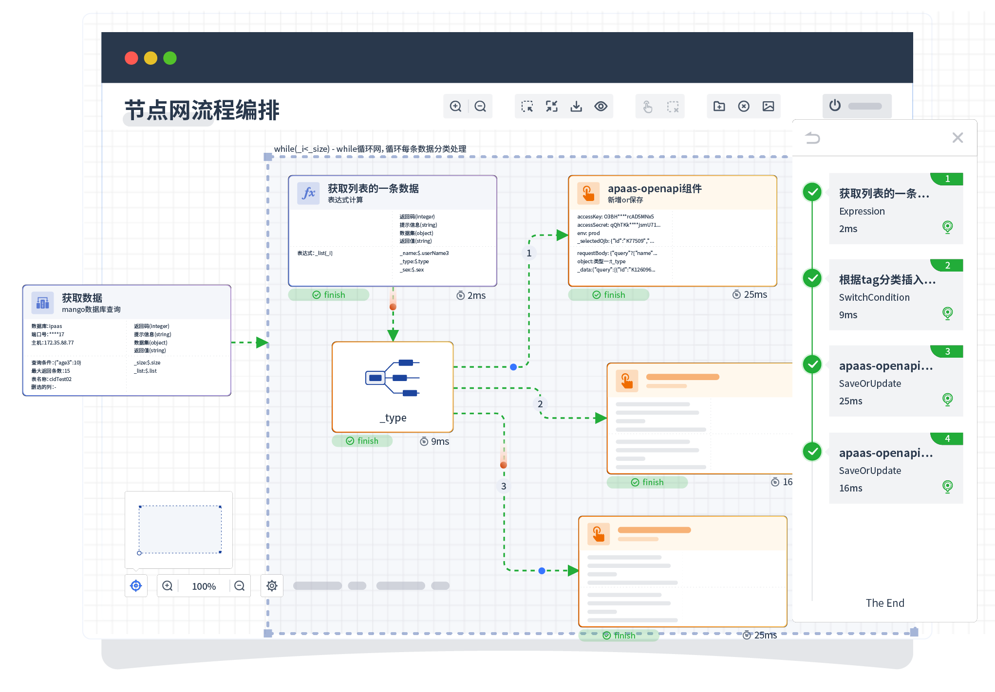 针对集成场景,,,,,,,,,,,,,,组件定义后支持进行流程编制,,,,,,,,,,,,不同于传统代码方式,,,,,,,,,,,通过图形化展示,,,,,支持在线调试、、、、日志查看和运行回放。。。。。。。。