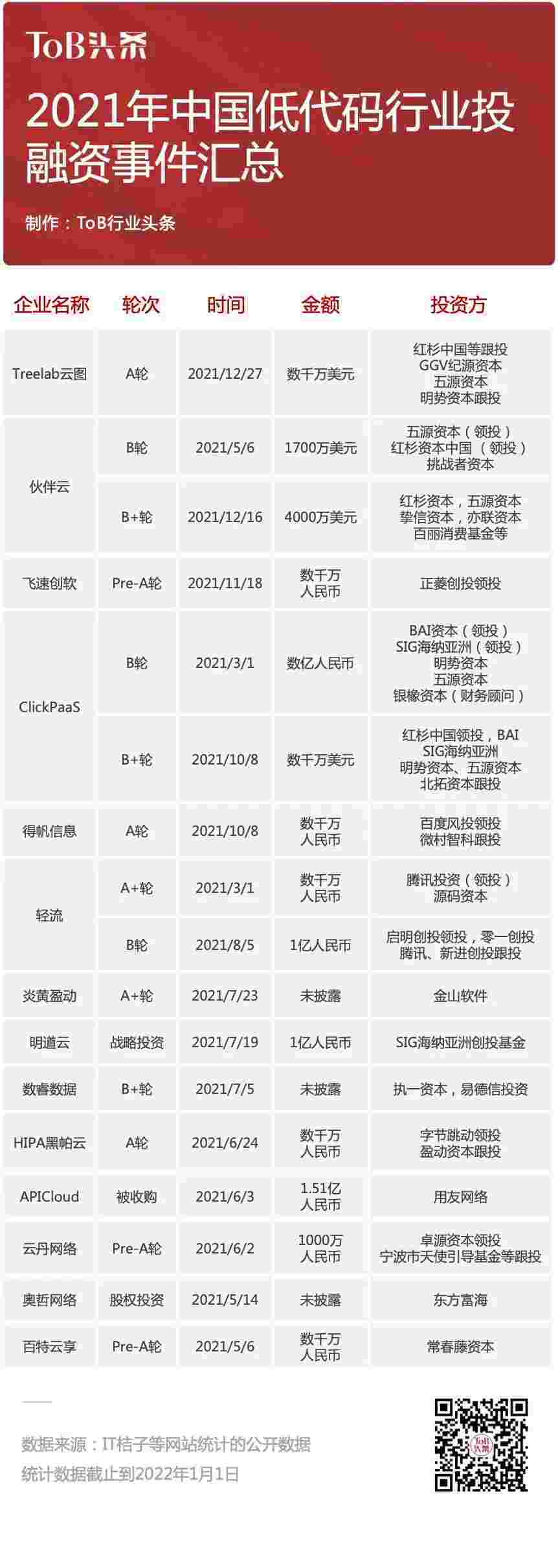 到2021年,,,,,无/低代码投融资规模势头更甚,,,,,,,,,其中包括轻流两轮融资(A+轮数千万人民币,,,,,,,,,,B轮近亿人民币)、、、、、、、、、、、、EBPAY 两轮融资(B轮数亿人民币,,,,,,,,B+轮数千万美元)、、、、、百特云享数千万元Pre-A轮融资......